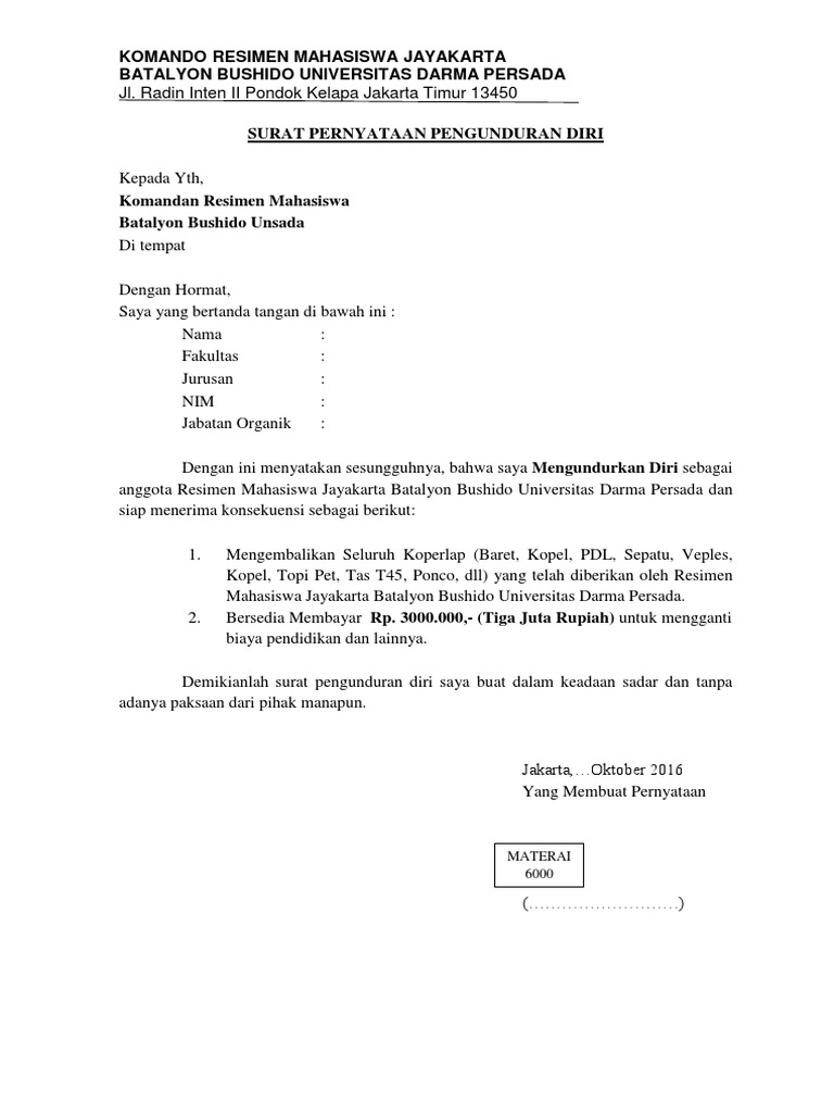 Kepala surat ↔ memuat kepada siapa surat itu ditujukan. Yang bertanda tangan di bawah ini:nama: Entah bagi yang ingin resign dari tempat kerja di perusahaan yang selama ini ia bernaung di bawahnya atau dari jabatan tertentu. Siswa yang bertanda tangan di bawah ini saya : Isi surat meskipun pendek dan sederhana namun harus mengemukakan isi yang padat, jelas dan mengena. Alasan yang menyertainya bervariasi, mulai dari lingkungan kerja hingga isu personal. Terima kasih telah berkunjung ke blog berbagi. Dalam sebuah perjalanan karir individu, resign ataupun berpindah pekerjaan merupakan sebuah hal yang sangat mungkin terjadi. Jangan sampai surat pengunduran diri secara sederhana ini melewatkan informasi apapun termasuk alasan. Saya berharap dapat terus berjaya dan memperoleh yang terbaik. Ketika mengajukan resign, kita harus memberikan alasan yang masuk akal dan logis. Buat surat pengunduran diri (resign) secara online. Fungsinya adalah untuk melegalkan status tanggung jawab di perusahaan dan persyaratan administratif.